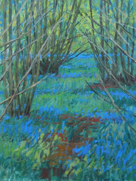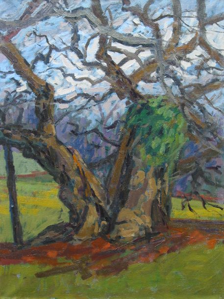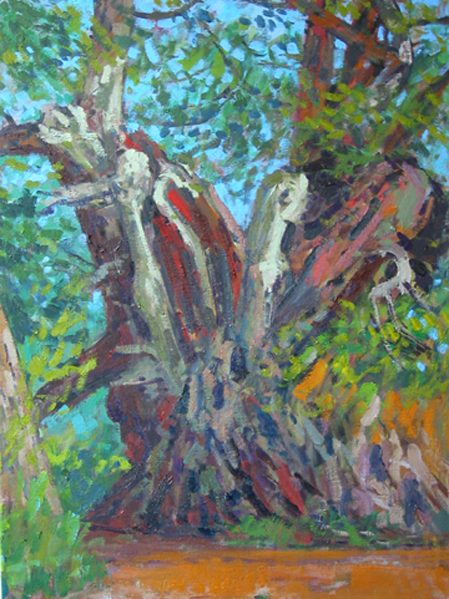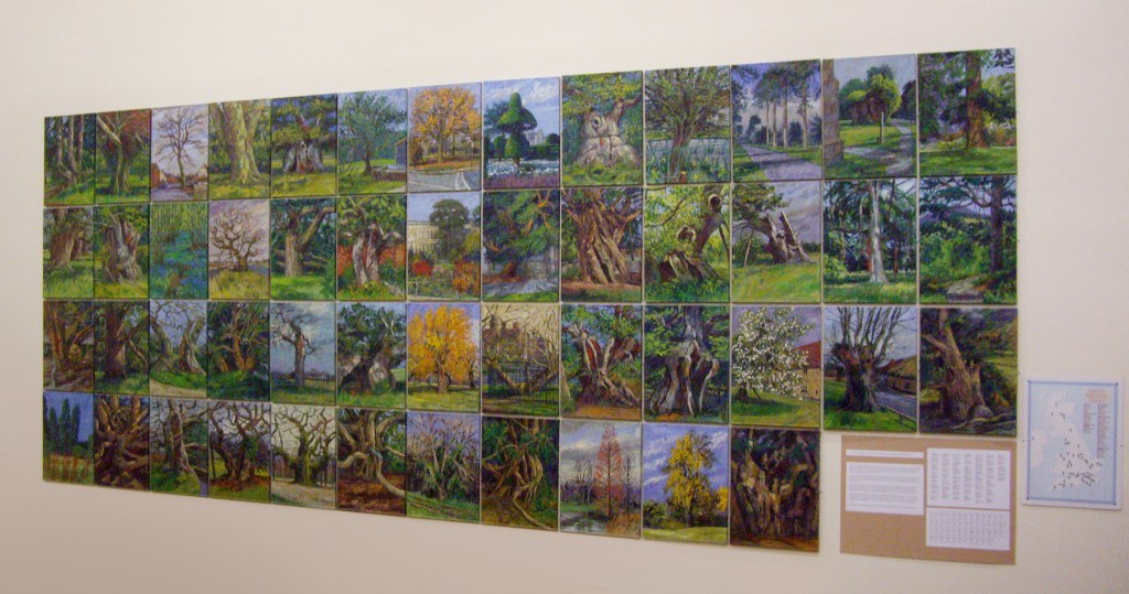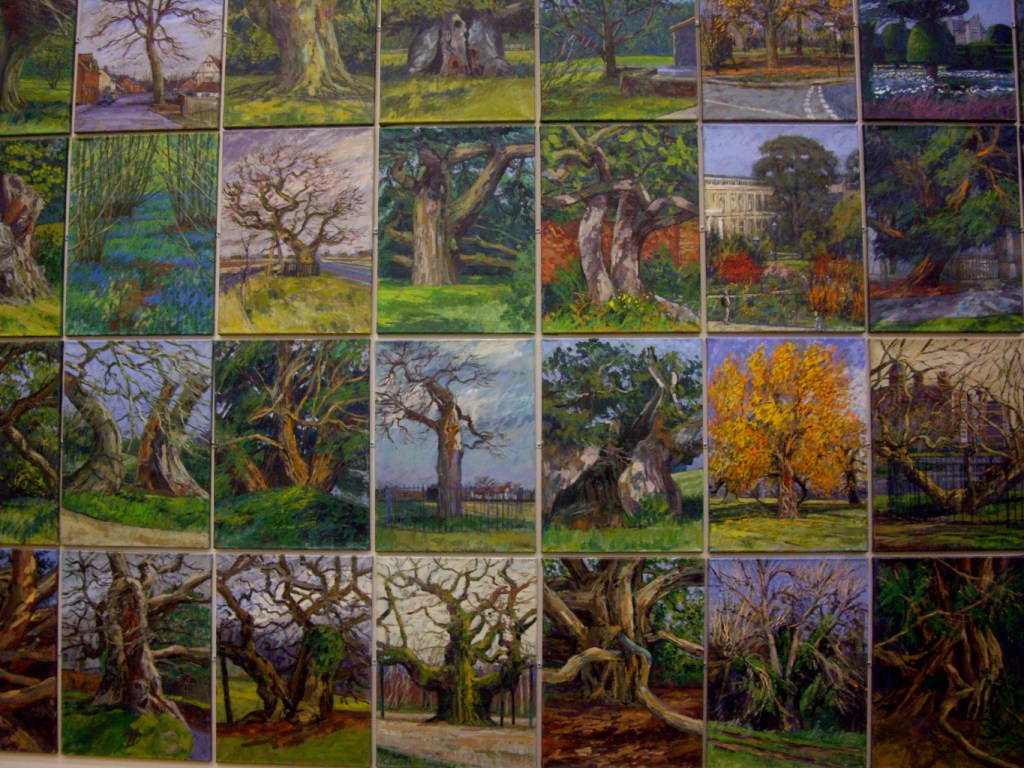 This involved travelling to many parts of the UK over a period of two years, and included the Fortingall Yew in Scotland, possibly the oldest living thing in Europe. At Westonbirt National Arboretum, the original lime can no longer be seen as one tree but has now become a copse of small trees amid bluebells. Painting Kett’s Oak, a tree closely connected to the Kett’s Rebellion of 1549, meant painting by the roadside on a windy plateau in December.
