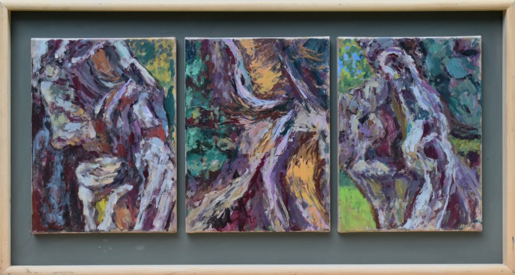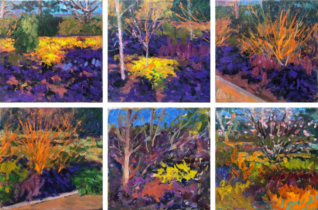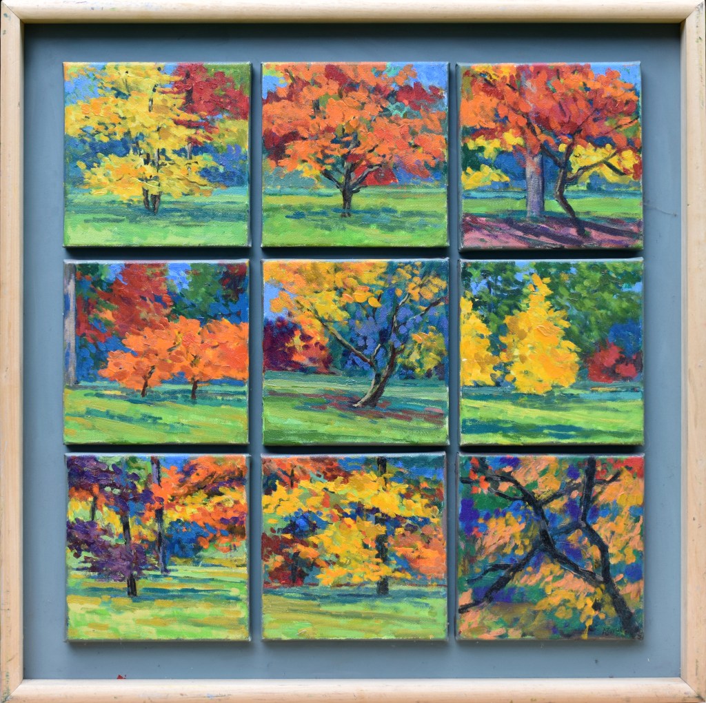 Typically, paintings show the subject from one viewpoint only. The idea of putting together various views of the subject is an attempt to overcome this limitation. How else could one do justice to the varied autumn colours of the Japanese maples at Westonbirt or the Winter Gardens at Anglesey Abbey? How else to illustrate the different views John Ruskin had from the turret he had built onto his bedroom overlooking Coniston Water. All are oil on canvas. Measurements not including frames.