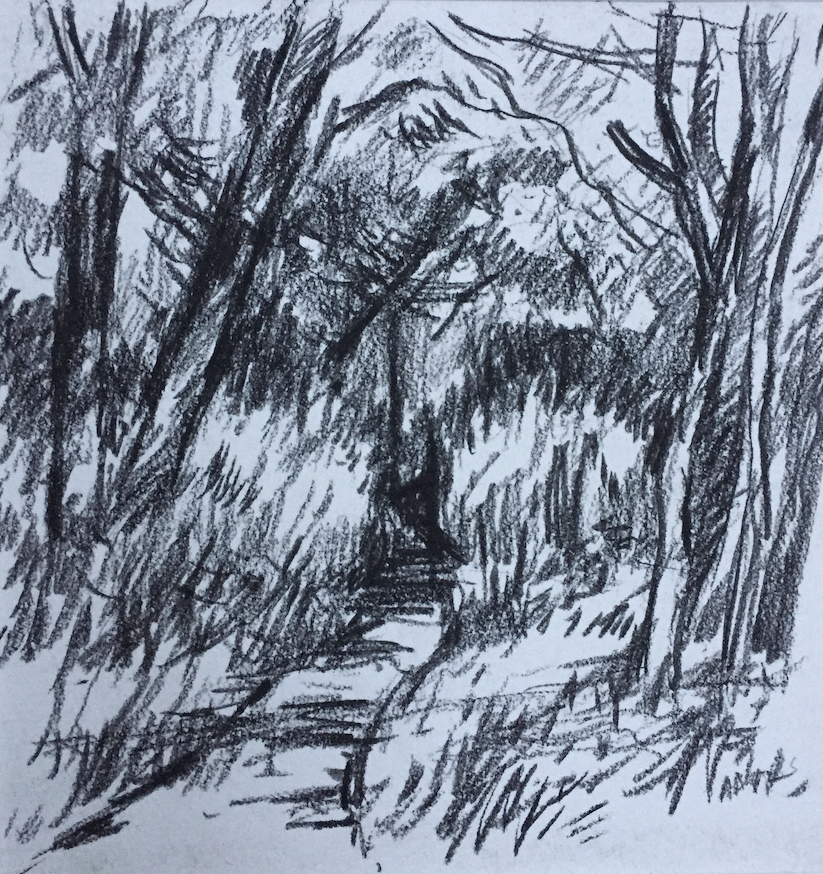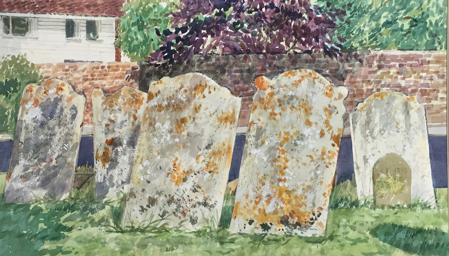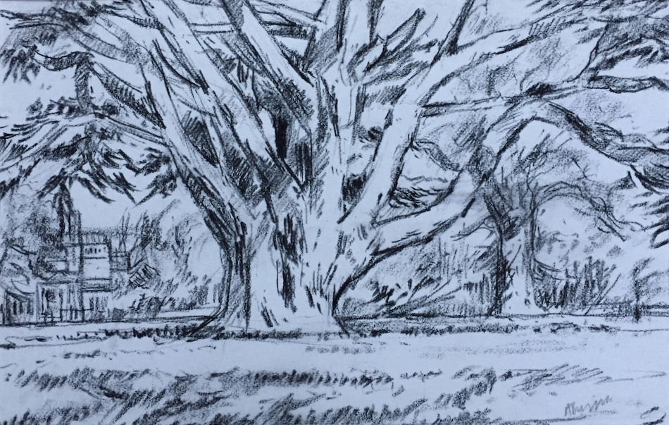 From Roydon Churchyard, watercolour, 26 x 44 cmsBlizzard in the Duddon Valley, pastel, 28 x 45 cmsCedar of Lebanon, Gaunt’s House, conté, 31 x 48 cmsConiston from Brantwood, acrylic, 22 x 30 cmsBlind Lane (2), conté, 26 x 25 cmsThe Sydney Oak, watercolour, 29 x 25 cms